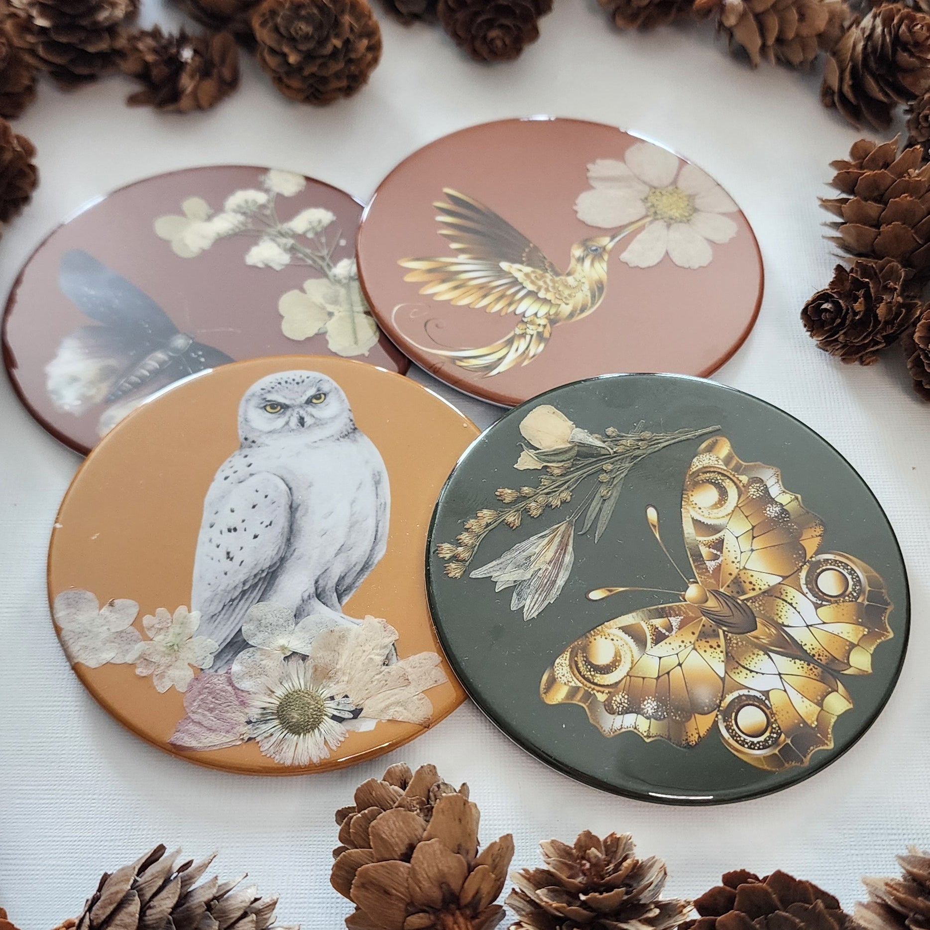 Bring a touch of autumn’s quiet magic to your table with the Gilded Wings Coaster Set. Each piece features a delicate winged design paired with real pressed flowers. Handcrafted and unique, these coasters are both functional and beautiful, making them a timeless addition to your seasonal décor.