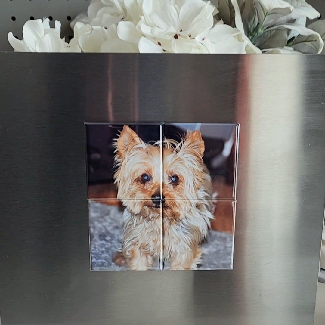 Our 4-piece magnet mosaic breaks your favorite photo into four sleek, glossy tiles that connect to reveal the full image. Simple, modern, and meaningful. Perfect for smaller spaces or sweet moments. High-definition photo memories that stick.